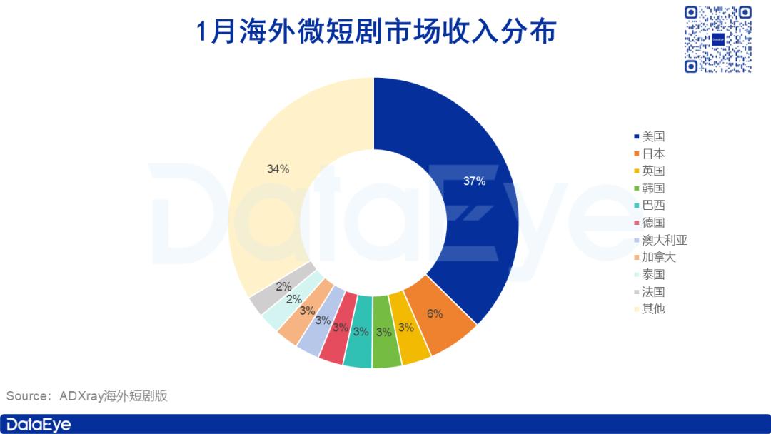 从收入占比来看,美国贡献了37%的市场份额,较12月环比下降4个百分点;日本占比6%,英国、韩国、巴西三国占比相近,均在3%左右。