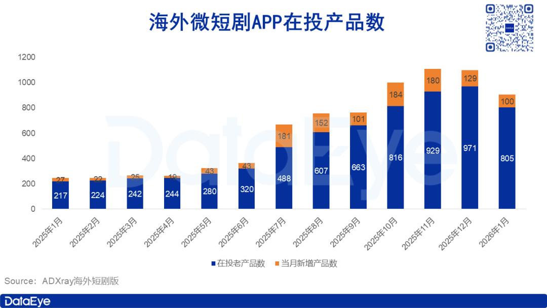 根据DataEye-ADX海外短剧版数据统计,2026年1月,海外在投微短剧APP共计905款,环比下滑 18%;当月新增APP数量为100款,在投总量与新增数量已连续两个月呈下滑趋势。