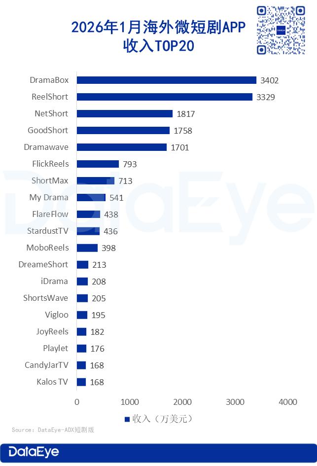 2026年1月海外微短剧APP收入TOP20排行榜中,TOP5玩家格局稳定但座次微调。DramaBox超过ReelShort登顶榜首,ReelShort退居第二,NetShort跻身第三。