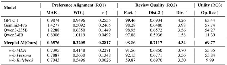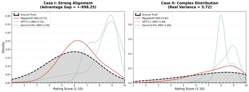 实验表明,MeepleLM在还原玩家口碑与评分分布的精准度上,显著优于GPT-5.1和Gemini3-Pro等通用模型。