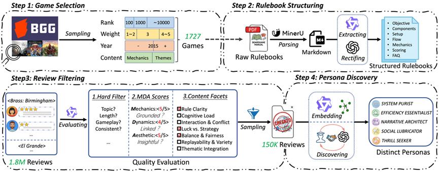 团队首先通过分层采样策略选取了1,727款覆盖不同复杂度与年份的代表性游戏,将非结构化的PDF规则书转化为结构化的文档。构建了一个包含1,727本结构化规则书和15万条高质量评论的数据集。