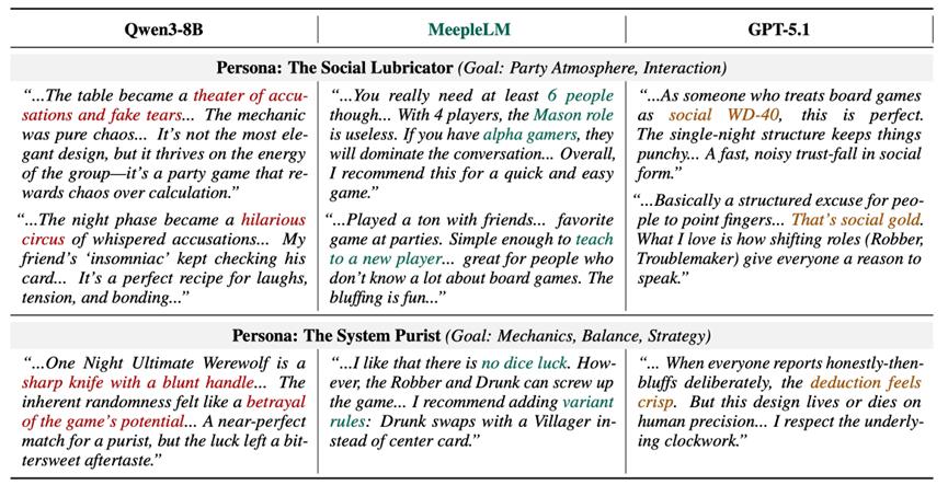 在评论内容的生成上,MeepleLM兼顾了事实准确性(Factuality)和观点多样性(Diversity)。如图6所示的关于《一夜终极狼人》的评价,Qwen3-8B采用一种通用的夸张煽情语气(“悲情剧场”),GPT-5.1听起来像一位冷漠的记者(“社交万能润滑剂”),但MeepleLM却能真实捕捉到每个角色的独特声音。