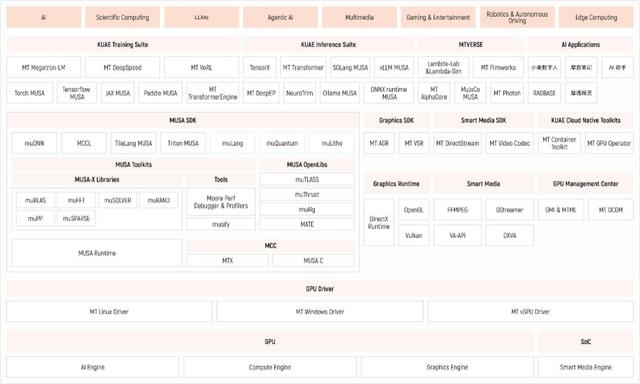 此外,MTT S5000对FP8到FP64全精度计算的完整支持,特别是硬件级FP8 Tensor Core的引入,成为了其性能跃升的核心引擎。据接近测试项目的行业人士透露,MTT S5000在产品精度层面已超越H100,技术特性更逼近英伟达下一代Blackwell架构。