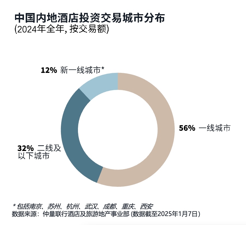 根据仲量联行发布的《中国内地酒店市场2024年回顾与2025年展望》显示,2024年,中国内地酒店投资交易城市中,二线及以下城市占比32%,明显高于新一线城市。