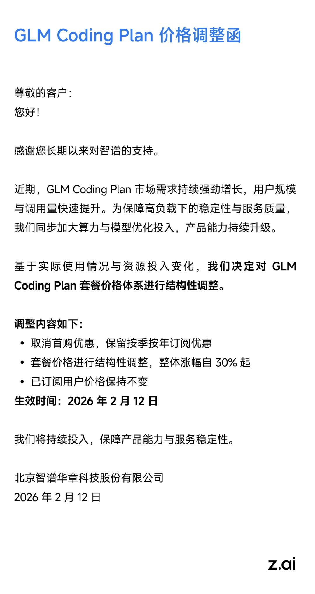调整内容显示:取消首购优惠,保留按季按年订阅优惠;套餐价格进行结构性调整,整体涨幅自30%起;已订阅用户价格保持不变。其生效时间为2026年2月12日。