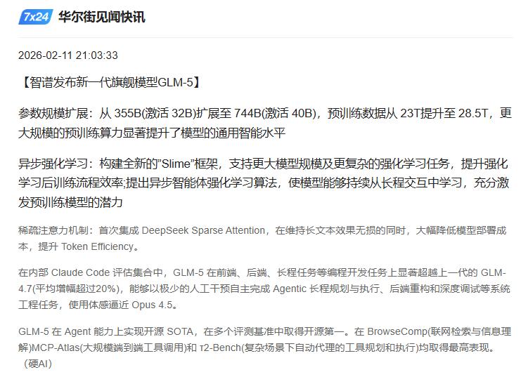 智谱于2月11日发布GLM-5(即此前神秘的“Pony Alpha”),参数规模从3550亿扩展至7440亿。