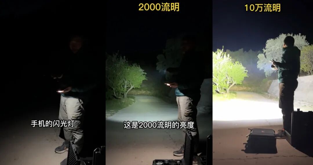 但当他在黑不见指的野外,把2000流明到10w流明的手电视觉效果依次展现出来,一下就更新了用户对于手电的理解。