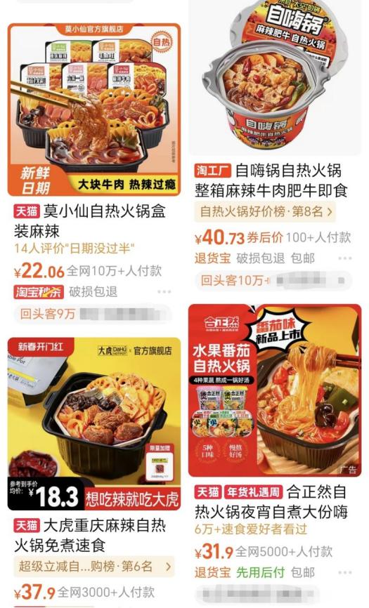 很多自热火锅的价格并不便宜,在同等价格的情况下完全可以选择其他适口性更高的食物。(图/电商平台截图)