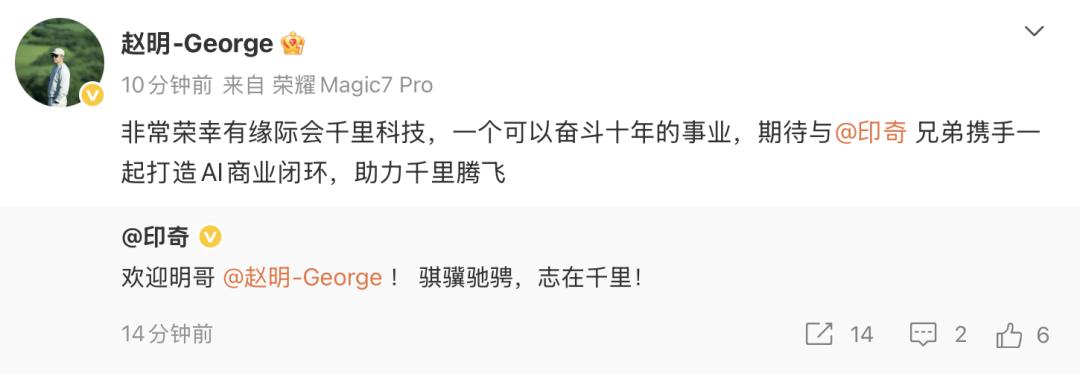 据车东西确认,公告中的赵明为前荣耀终端股份有限公司CEO赵明,他本人也在个人微博上官宣,并和千里科技董事长印奇进行了一波互动。