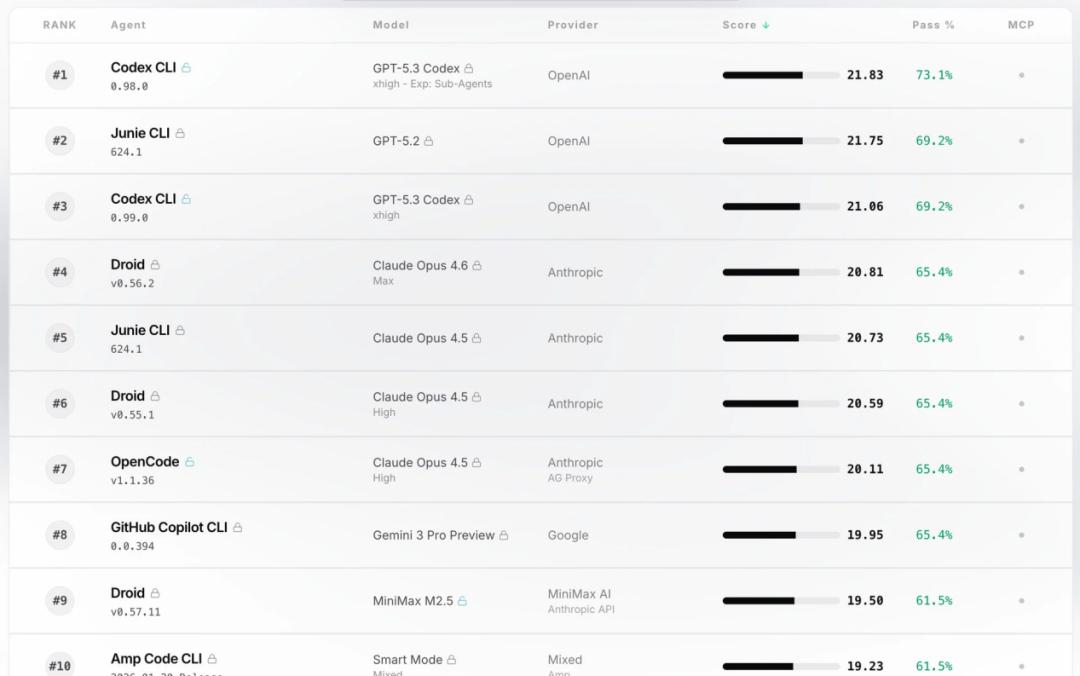 虽然仍无权威性测试结果,但社区的第三方实测提供了有限验证。在一项自发组织的代码修复能力测试中,M2.5在多平台环境下位列第九,通过率为61.5%。而作为参照的GPT-5.3 Codex以73.1%的通过率位居榜首,Claude Opus 4.6的通过率为65.4%。
