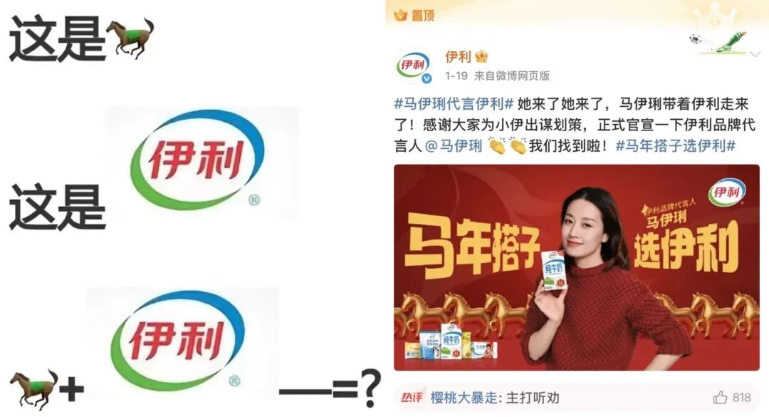 最早是有网友脑洞大开,说“马年伊利代言人该请马伊琍啊”,连广告词都给写好了——“我是马伊琍,马年喝伊利”。大家还自发编了商战剧情:伊利再不请,蒙牛就要请了,广告词就是“伊琍都说蒙牛好”。