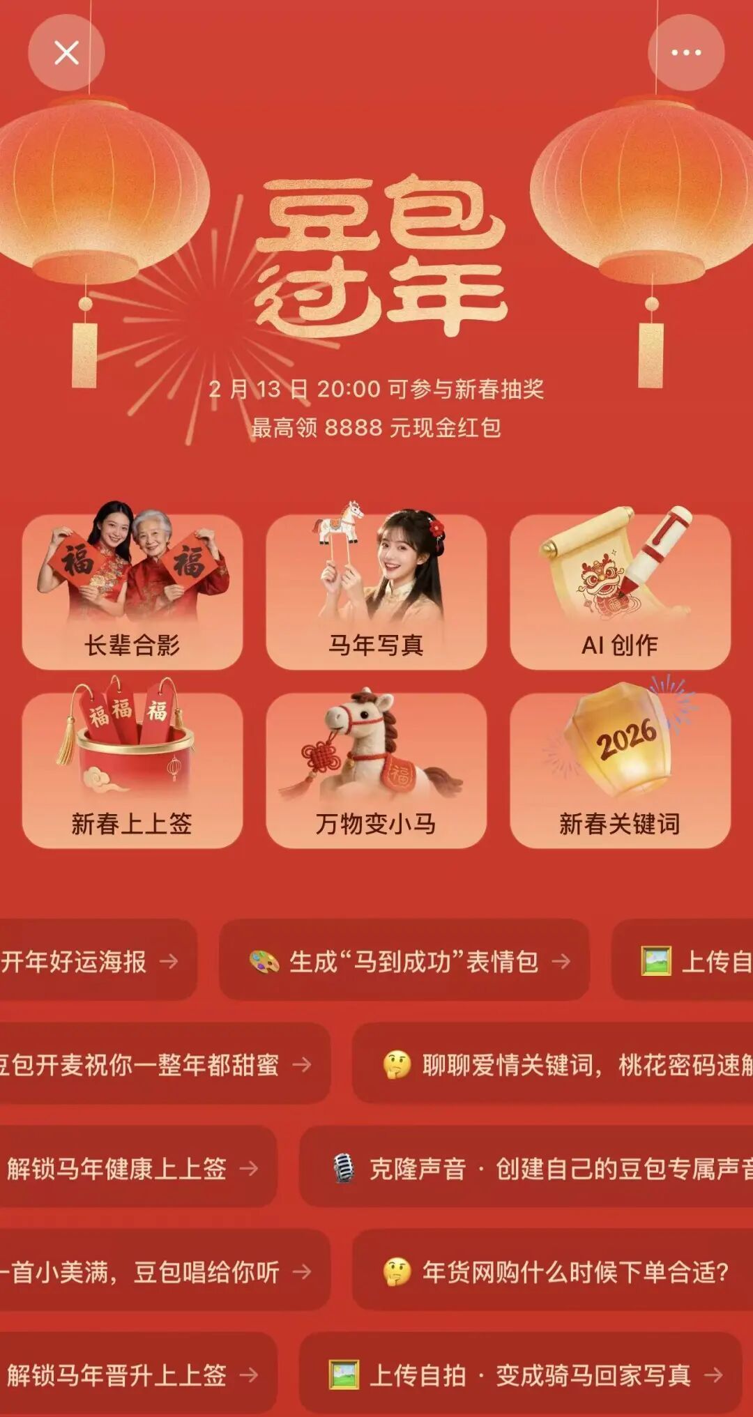 在春晚期间,“豆包过年”活动可以体验多种AI玩法,例如,一键生成新春写真和头像,创作祝福卡片和拜年视频,还有名人语音拜年等。用户无需下载独立App,在抖音内即可调用豆包完成任务,获得虚拟福卡、限定装扮或抽奖机会。这些玩法虽无直接现金激励,但通过趣味性与社交裂变设计,有效提升了用户对豆包的认知与使用频次。