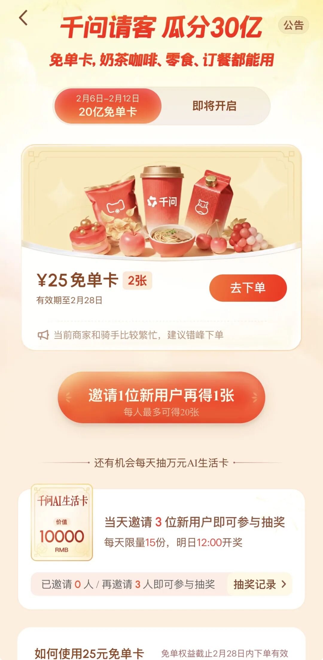 阿里千问抛出重磅计划,投入30亿元启动春节请客计划,联合淘宝、闪购、盒马、飞猪等应用,覆盖用户吃喝玩乐全场景。