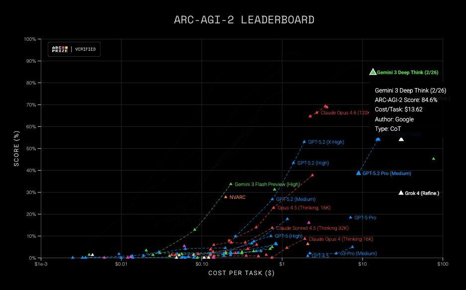 新版 Gemini 3 Deep Think 在 ARC-AGI-1 上的成绩是 96.0%,每任务花费 7.17 美元;在 ARC-AGI-2 上已经达到了 84.6% 的分数,每任务成本为 13.62 美元。