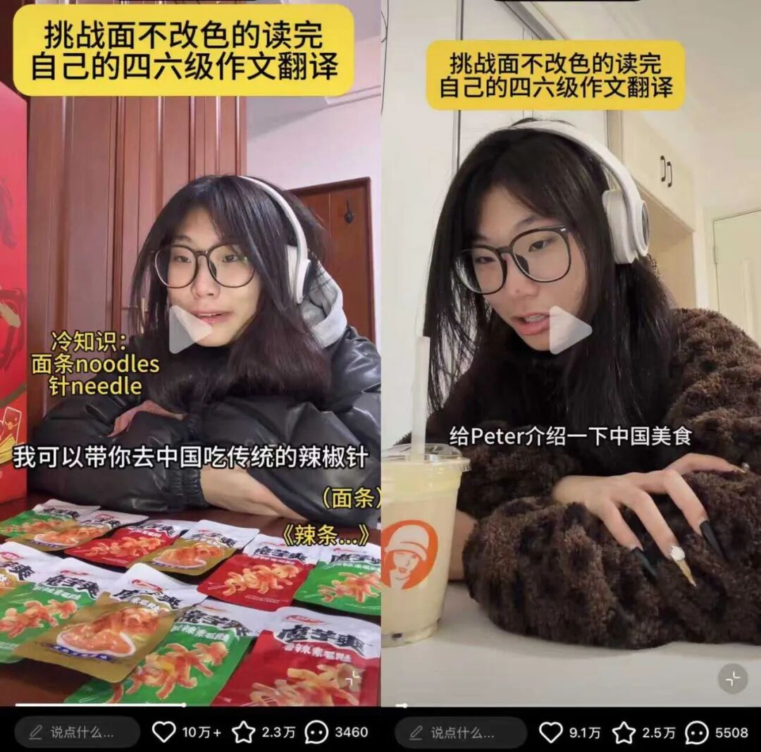 去年11月,她发布了第一条“挑战面不改色读四六级作文翻译”的视频,自此便成为Peter最严厉的母亲,将大洋彼岸的Peter玩弄于股掌之间。