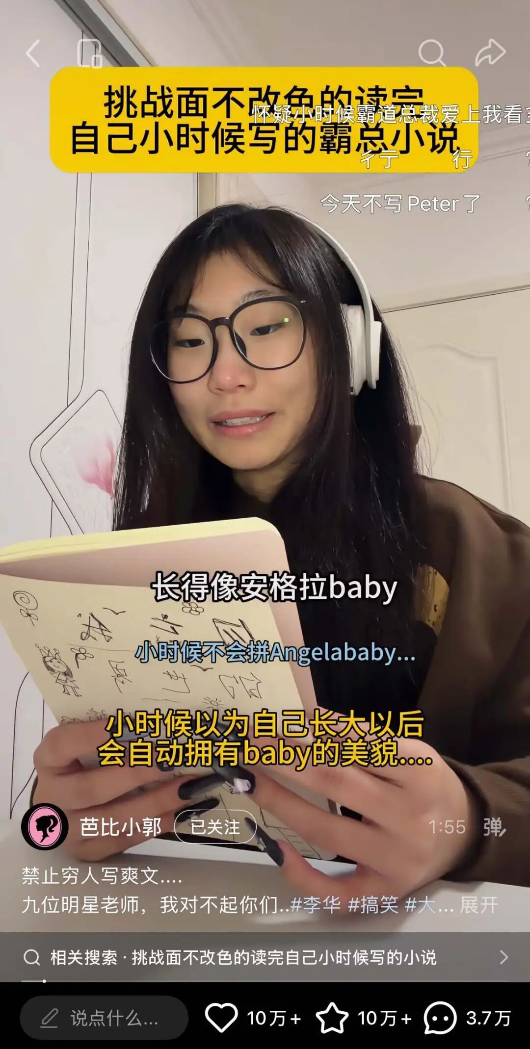 在一期“挑战面不改色地读完自己小时候写的霸总小说”的视频中,“芭比小郭”笔下的女主角是一位长相如“安格拉baby”的校花(此处博主不会拼Angelababy),出身贫寒,一年仅有50元的生活费。