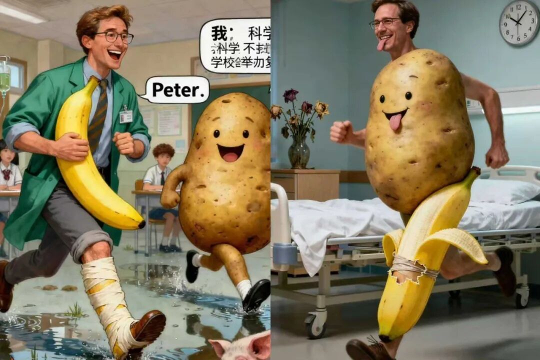 她看到Peter左腿缠着大香蕉,像一个开心的大土豆跑过来,兴奋地说:“他被宣告死亡了。”