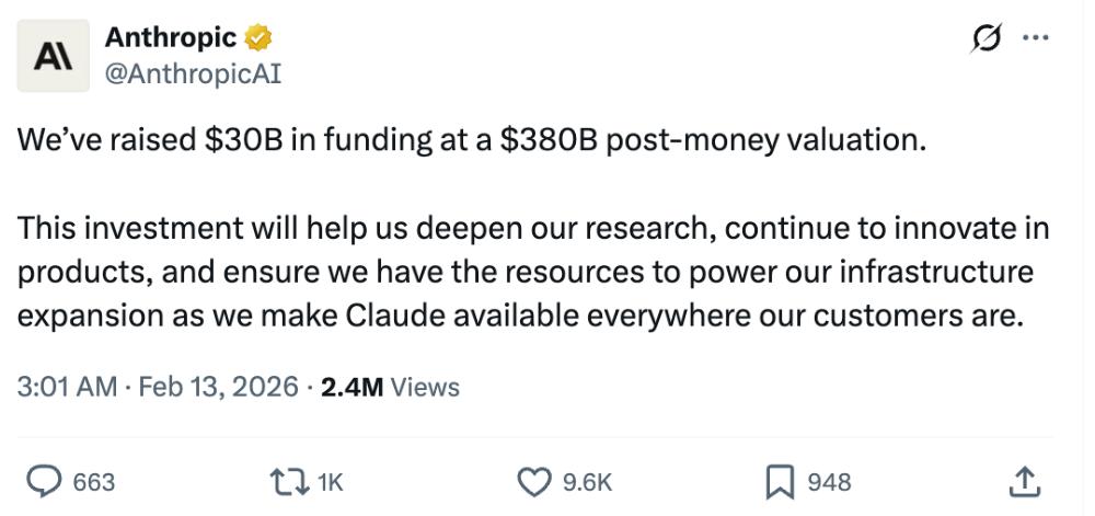 智东西2月13日报道,今天凌晨,AI独角兽Anthropic宣布已完成300亿美元(约合人民币2070.19亿元)G轮融资,投后估值达3800亿美元(约合人民币2.62万亿元),公司年化经常性收入已达140亿美元(约合人民币699.09亿元),在过去三年中每年平均增长超10倍。