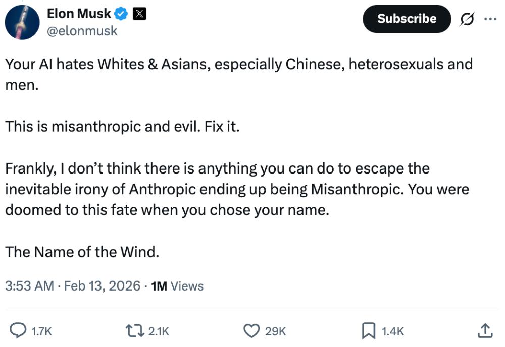 消息一经发布,马斯克立刻跳出来质疑Anthropic的Claude模型涉及种族和性别歧视的问题。
