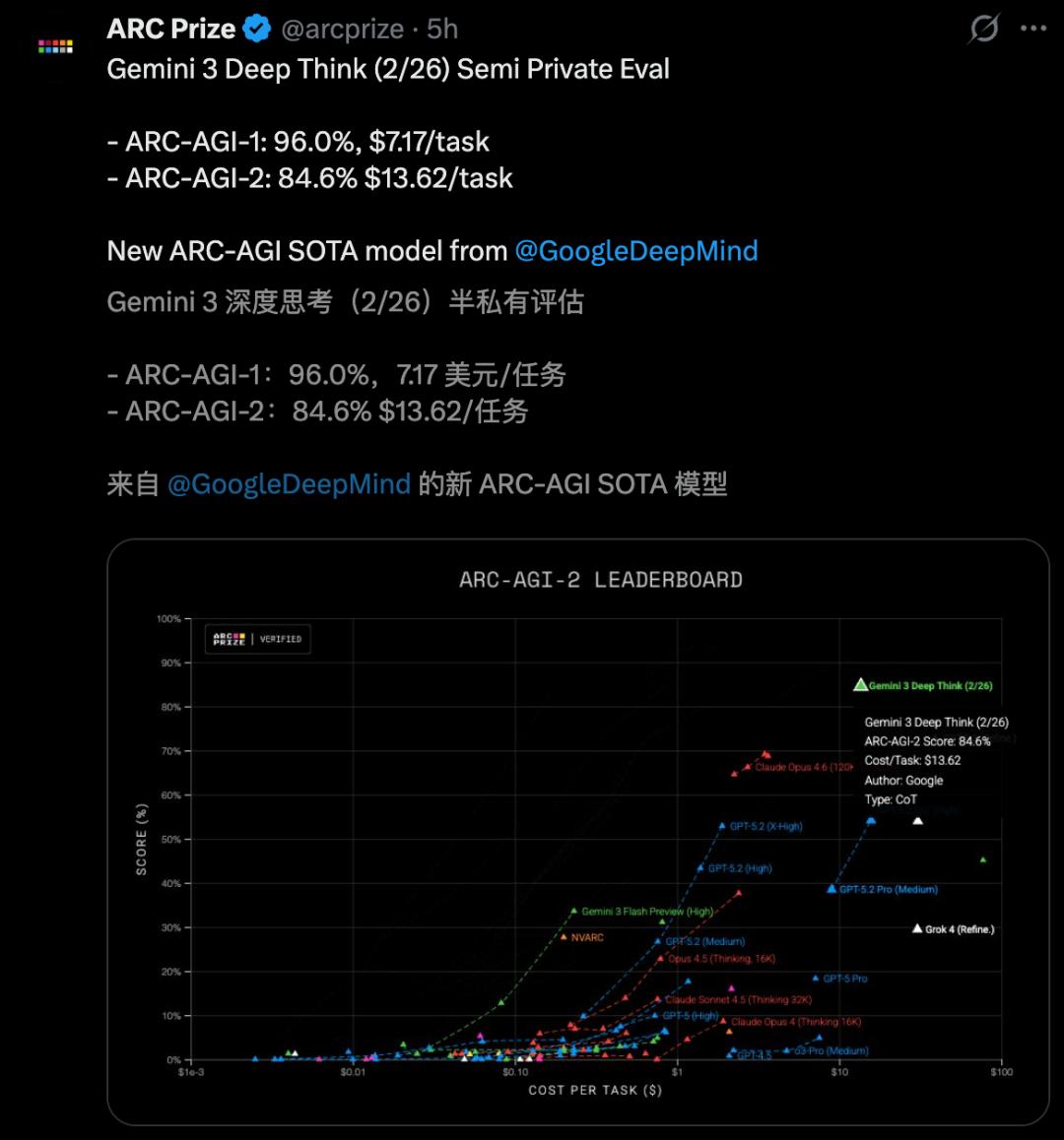 - ARC-AGI-2:达到了前所未有的84.6%,并获得ARC奖项基金会的验证;