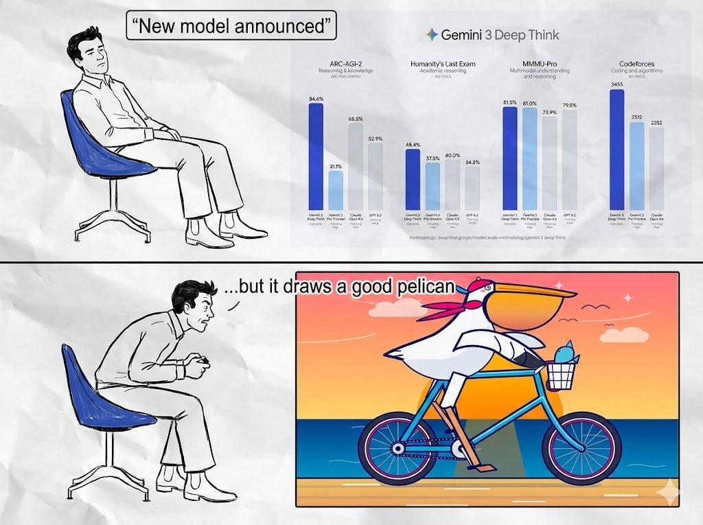 Simon Willison用Gemini 3 Deep Think画了一张鹈鹕骑自行车的SVG矢量图,效果非常惊艳。