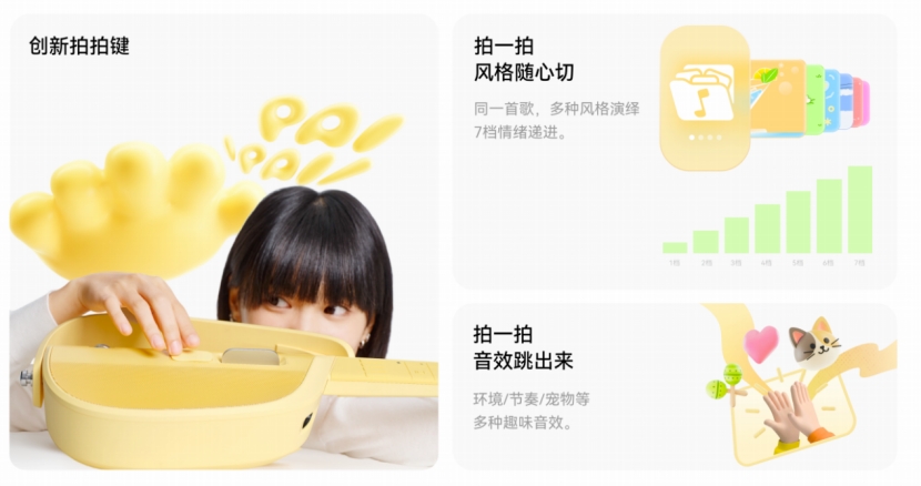 U1的“拍拍键”功能正是为此设计。拍打琴身即可切换七档情绪风格,同一段和弦行进,可以在轻快与舒缓之间重新演绎;音色库拓展至近40种乐器,钢琴、竖琴、尤克里里被集成进同一把琴体;内置3种鼓机模式支持手自切换,单人即可完成多声轨铺陈。环境、节奏、宠物等趣味音效的加入,也为乐器互动提供了更简洁轻量的触发方式。