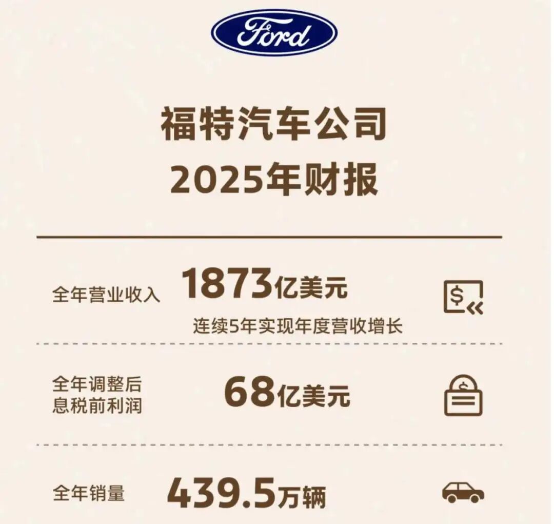 2月11日,福特汽车发布2025年第四季度财报和2025年全年财报,全年来看,营收1873亿美元,同比增长1.23%,创历史新高,然而增收的背后却是巨亏。