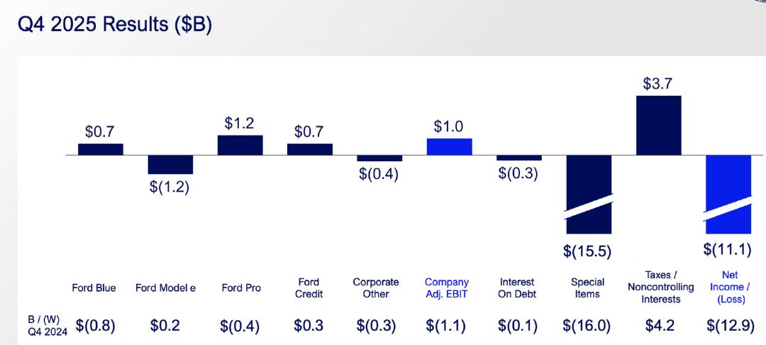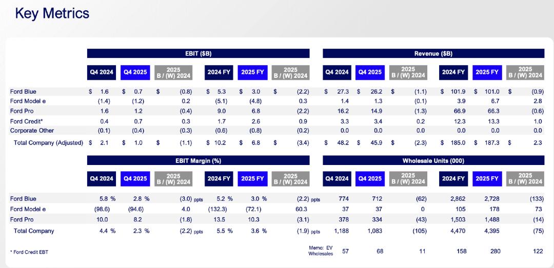 但电动部门接连的亏损,也让福特不得不重新审视此前对于电动车业务的大规模投入,这也是为何福特在2025年最终录得巨额亏损的原因。