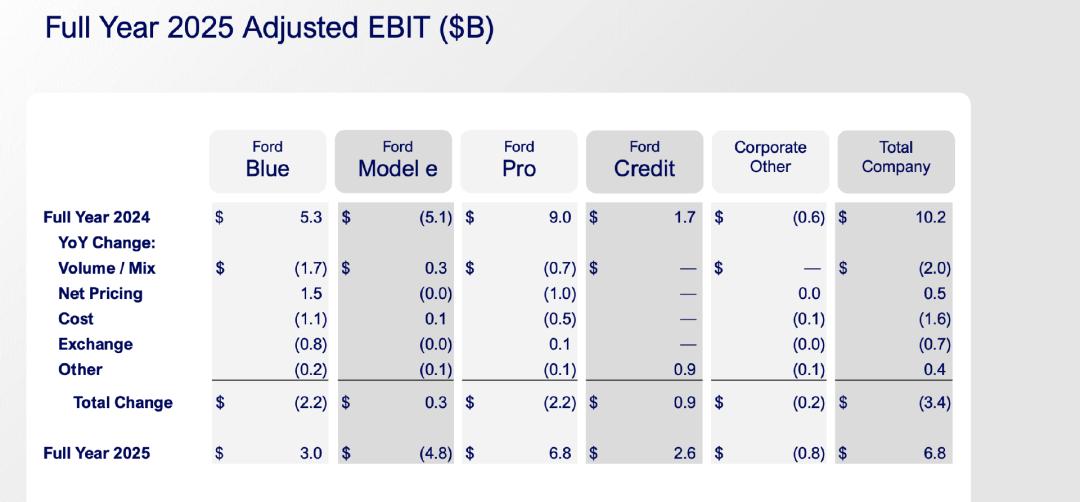再加上其他两项业务,Ford Credit和Corporate Other,前者2025年净利润为2.55亿美元,后者则亏损8.3亿美元,这几项业务叠加之下,68亿美元的盈利呼之欲出。