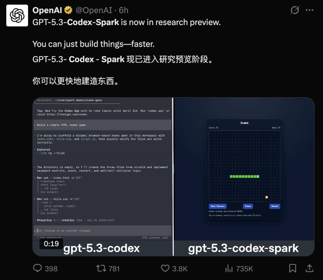 在OpenAI发布面向实时编码场景的Codex-Spark研究预览版后,在 x 上迅速展开讨论。与官方强调的“超低延迟”和“即时协作体验”相比,社区关注的焦点明显更加集中在一个问题上:在速度大幅提升的同时,模型是否还能维持足够的推理深度与代码质量。