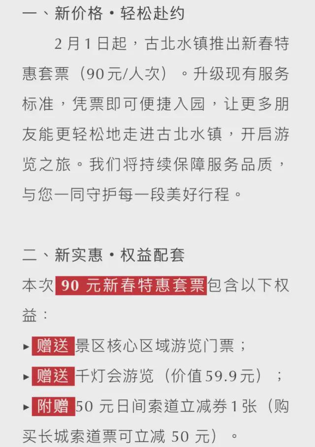这也解释了为何免票政策仅实施两个月,古北水镇便在2026年2月1日推出“90元新春特惠套票”。该套票包含核心区域游览门票、千灯会及50元日间索道立减券,但是被市场解读为“变相恢复收费”。