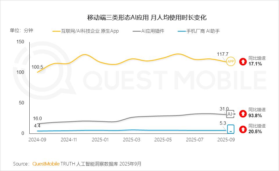 2024年,Gartner披露的调研报告显示,消费级AI应用的30天平均留存率仅为12.8%,比传统移动应用低12.2个百分点。QuestMobile数据显示,截至2025年9月,AI原生App月人均使用时长为117.7分钟,虽然同比上涨17.1%,但日人均仅使用3.92分钟,远不及微信、抖音、小红书等高粘性产品。