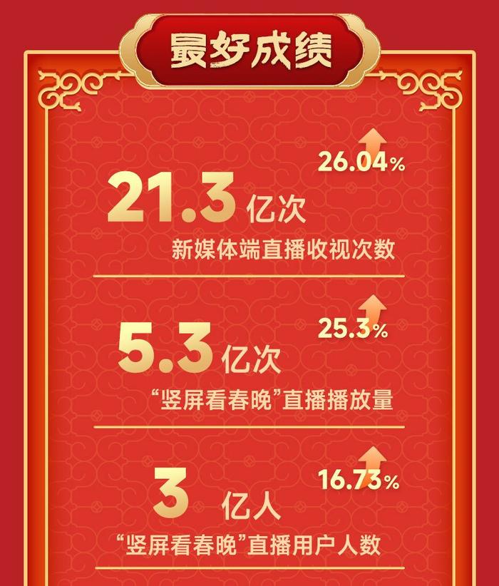 事实证明,牵手新媒体平台后,春晚确实触达了更广的人群。官方资料显示,截至2025年1月29日,2025年春晚在新媒体端直播收视次数达21.3亿次,同比上涨26.04%;“竖屏看春晚”直播播放量达5.3亿次,同比提升25.3%、用户数达3亿,同比提升16.73%。