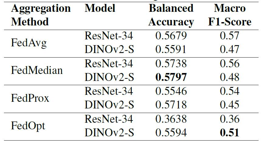 值得注意的是,FedOpt 表现出极大的波动性:在 ResNet-34 上表现极差(平衡准确率 0.3638),而在 DINOv2-S 上保持了有竞争力的性能(平衡准确率 0.5594);相比之下,FedAvg 和 FedProx 在两种模型上表现相对稳定;FedMedian 在两种架构上表现最一致,分别达到 ResNet-34 的平衡准确率 0.5738 和 DINOv2-S 的 0.5797。