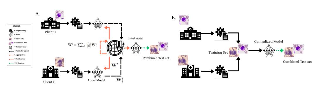 近年来,人工智能和深度学习的发展为血液形态分析提供了新的解决方案。AI 模型能够自动识别不同类型的白细胞,并辅助医生进行快速诊断。研究表明,深度学习在自动化血液学诊断中具备显著潜力,但现实应用中仍面临重要挑战——模型训练对数据的依赖性极强,而临床数据通常分布在不同医院,且存在染色方法差异、成像设备差异以及少数罕见细胞类型的问题。这种数据异质性会导致模型在新机构或新患者群体中泛化能力下降。