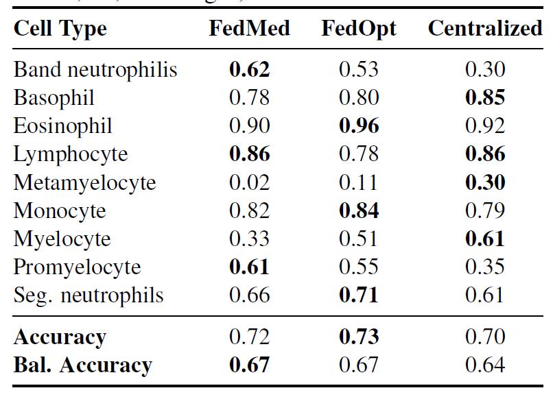 FedMedian 在少数类细胞上表现出特别显著的提升:带状中性粒细胞(Band neutrophils)F1: 0.62 vs 集中式 0.30(提升 107%),早幼粒细胞(Promyelocytes)F1: 0.61 vs 0.35(提升 74%),显示在不同机构协议下诊断相关特征得到了有效保留。然而,对中幼粒细胞(Metamyelocytes)的识别对所有方法仍然具有挑战性(F1: 0.02-0.30),反映出从极其罕见类别学习稳健表征的根本困难