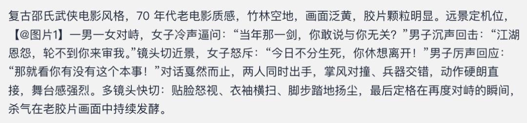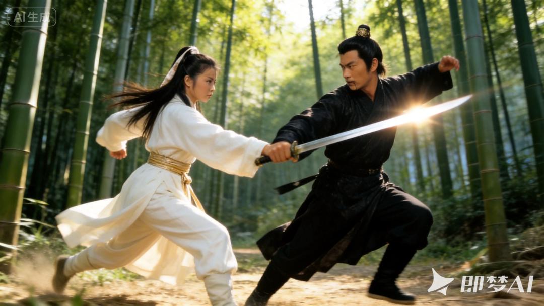 先来点开胃菜,最近网上邵氏武侠AI视频火得不行,于是我直接输入一张武林中人对打的动作写真照: