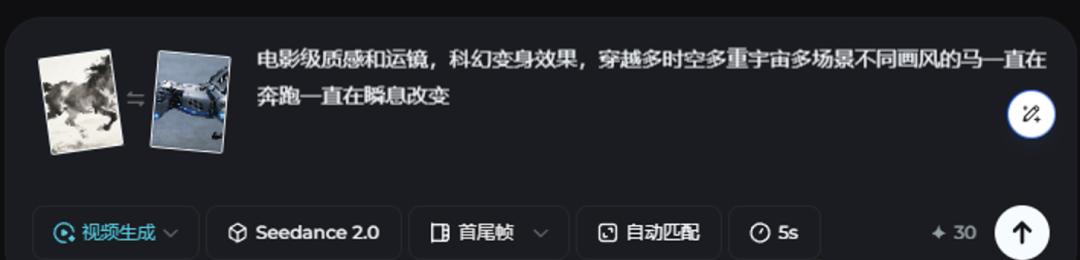 咱再来玩个首尾帧玩法,马年到了正好应应景,我上传了两张画风完全不同的马儿奔跑图片,让这匹马在同一个画面里完成一次大变身: