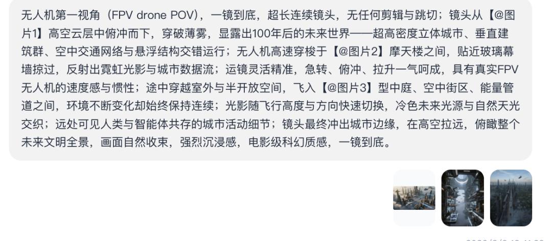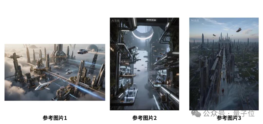 这次,咱玩点未来科幻感的,我直接给模型喂了三张赛博味拉满、视角各不相同的一百年后的地球城市参考画面: