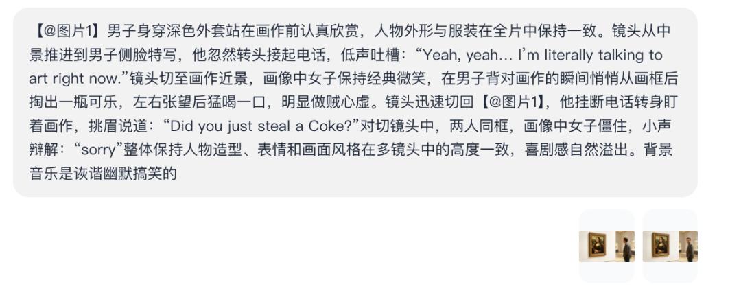 在提示词设计里,蒙娜丽莎需要始终固定在原有画像中完成掏可乐、喝可乐这样幅度不小的动作,还要同步出现说话表情,对模型的稳定性要求一下子就拉高了: