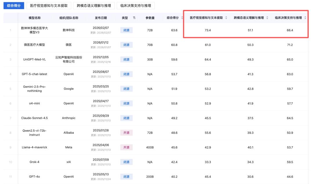 榜单中列出了医疗视觉感知与文本提取、跨模态语义理解与推理、临床决策支持与推理三大细分指标。