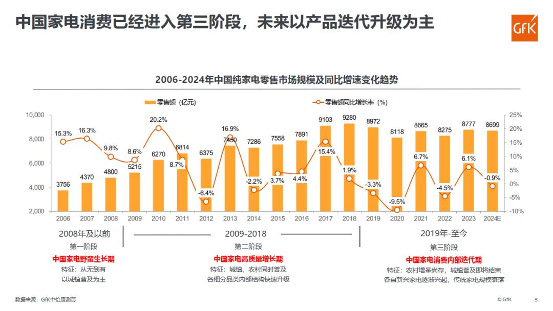 2019年以前,家电行业零售额增速虽然有所放缓,但依然保持逐年增长。从 2019 年开始,行业增速首次出现下滑,之后几年,家电市场规模逐渐恢复至疫情前水平,但整体增速明显不及2019年前水平,且呈现出新兴家电需求旺盛,传统白电增长缓慢的趋势。