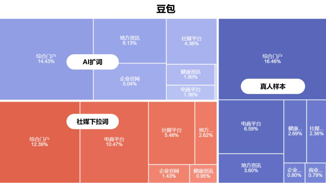 而在 AI 扩词组中,能覆盖这种复杂度的比例只有 50%。在社媒下拉词中,这个比例甚至不到 30%。