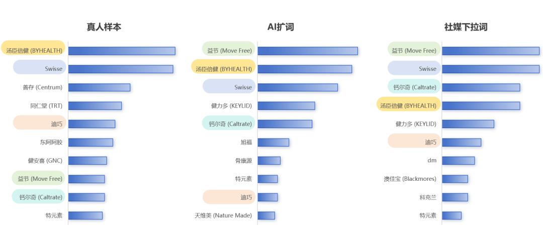 虽然都涵盖了汤臣倍健、Swisse、益节、钙尔奇等核心品牌,但在具体的排序逻辑上,三组问题的不同问法,触发了完全不同的算法机制: