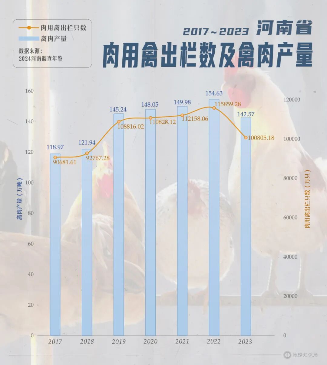 根据中国产业研究院的数据,2022年河南城镇居民人均消费禽肉9.5公斤,这里面主要都是鸡肉。河南省的禽类养殖规模庞大,2022年家禽出栏量达11.58亿只,平均每个人能分将近12只。