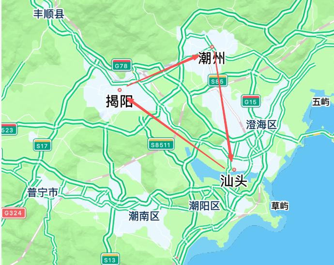 地图上,三个城市构成了一个很紧凑的三角形。从潮州出发到汕头40多公里,从汕头到揭阳50多公里,揭阳到潮州只有30公里,总里程也不到150公里。不下车的话,自驾一天能转好几圈。