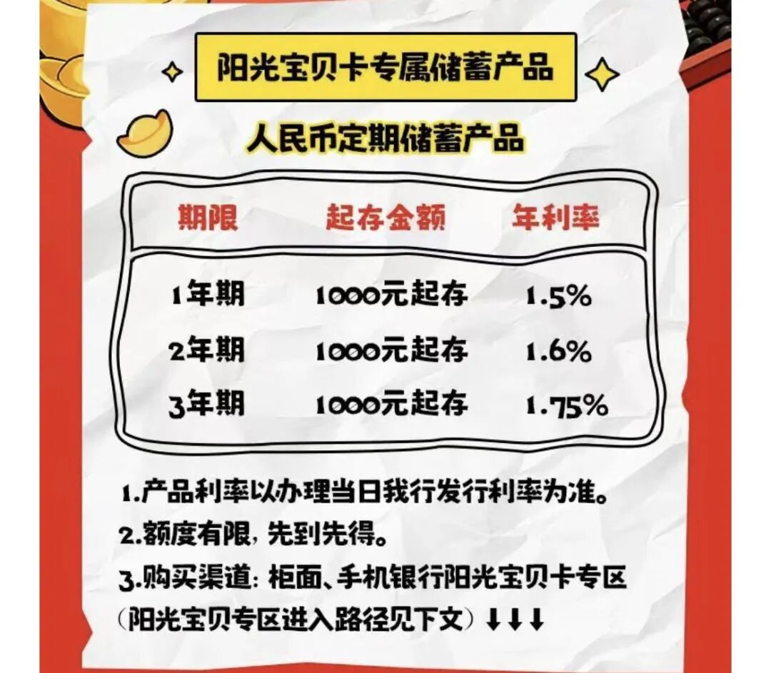 在存款利率上,部分银行针对压岁钱推出专属存单,并且利率也较银行挂牌利率有所上浮。比如,北京农商行推出阳光宝贝卡专属储蓄产品,起存金额1000元,1年期、2年期和3年期年利率分别为1.5%、1.6%、1.75%,而同期限定期存款挂牌利率分别为1.15%、1.2%、1.3%,该行App显示最新发售的20万起存、2年期大额存单产品年利率为1.5%。蒙商银行推出的压岁宝存款产品,起存金额500元,发行期为2月15日至3月20日,1年期、2年期、3年期年利率分别为1.4%、1.45%、1.75%。