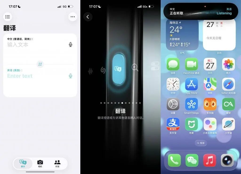 其实 iPhone 自己就自带了一个「翻译」App,更妙的是,如果你是带有侧边「操作按钮」的型号,还可以把实时翻译的功能,绑定到这颗按钮上,需要使用时直接长按呼出,连手机都不用解锁。