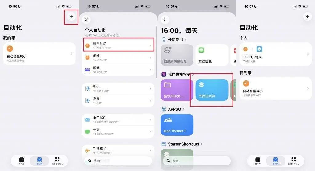 添加之后,在快捷指令 App,选择「自动化」,点击右上角的「+」号创建自动化。
