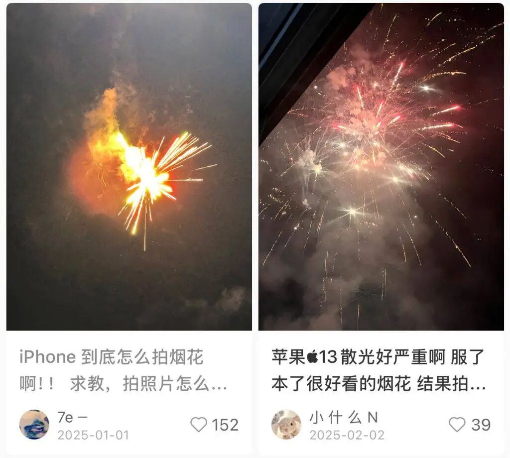 就比如烟花这种瞬时高亮又色彩丰富的场景,国产影像旗舰基本都配备了「烟花模式」,出片干净又绚丽,而 iPhone 成片总是糊作一团。